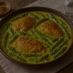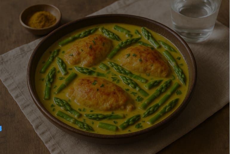 Poulet à la crème de coco, curry & pointes d’asperges
