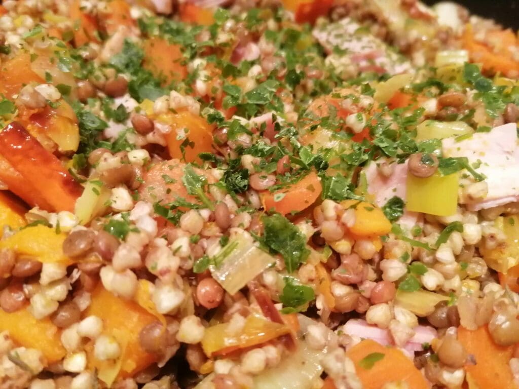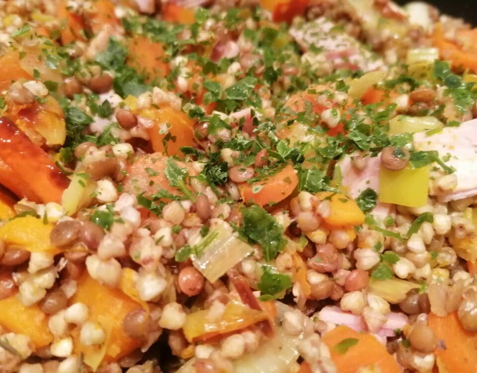 Poêlée complète sarrasin & lentilles rosées, légumes fondants et œufs (ou jambon)