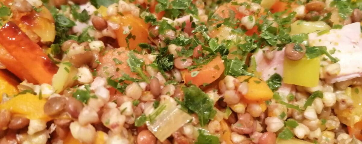 - Sarrasin + lentilles rosées : apportent des glucides complexes, des protéines végétales et des fibres → bonne satiété