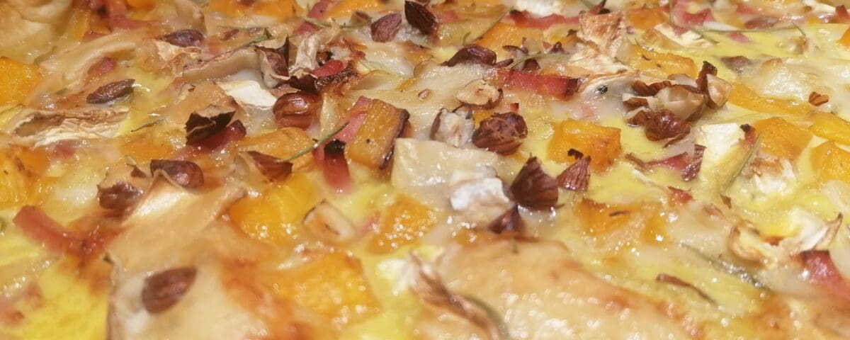 - Répartir courge, allumettes de jambon et oignon sur la pâte. Ajouter chèvre et noisettes.